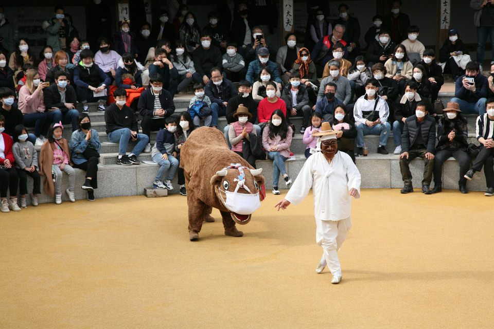 하회별신굿탈놀이 상설공연 장면. 코로나 19로 소도 마스크를 차고 있다.