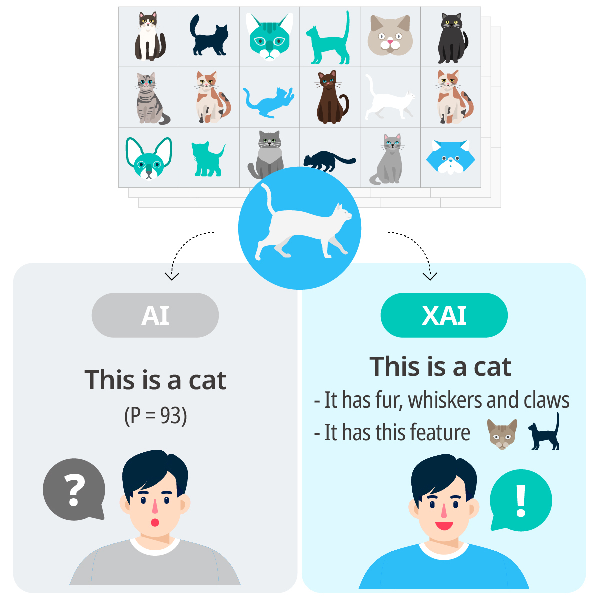 설명 가능한 인공지능(XAI)은 이러한인공지능의 한계를 극복하기 위한 기술로 판단 결과에 대한 해석 능력을 제공하기 위한 기술이다. 설명 가능한 인공지능의 대표적 기법으로는 특성 중요도(featureimportance), 부분 의존성 플롯(partial dependence plots), 대리 분석(surrogate analysis) 등이 있다. 특성 중요도와 부분 의존성 플롯은 데이터의 특성이기계 학습모델의 성능에 어떠한 영향을 미치는지 측정하여 연관성을 조사하는 기법이다. 한 특성값을 변형하여기계 학습모델의 예측 성능이 크게 감소하였다면 해당 특성의 중요도가 높다고 해석한다. 대리 분석은 주어진기계 학습모델과 최대한 유사한 결과를 내도록 설명 가능한 함수들로 모델을 변환하여 성능을 비교하는 것으로기계 학습모델의 결과를 간접적으로 설명한다. 설명 가능한 함수들로는 의사 결정 트리(decision tree), K-최근접 이웃(k-nearest neighbors) 기법 등 해석이 용이한 모델을 사용한다. 객체 인식(object recognition)에 설명 가능한 인공지능(XAI)을 사용하면기계 학습모델이 고양이를 인식할 때 털의 유무, 귀의 모양 등과 같은 특성으로 인해 몇 퍼센트의 유의 확률로 고양이라는 결과를 도출했는지 제시해 줄 수 있다.